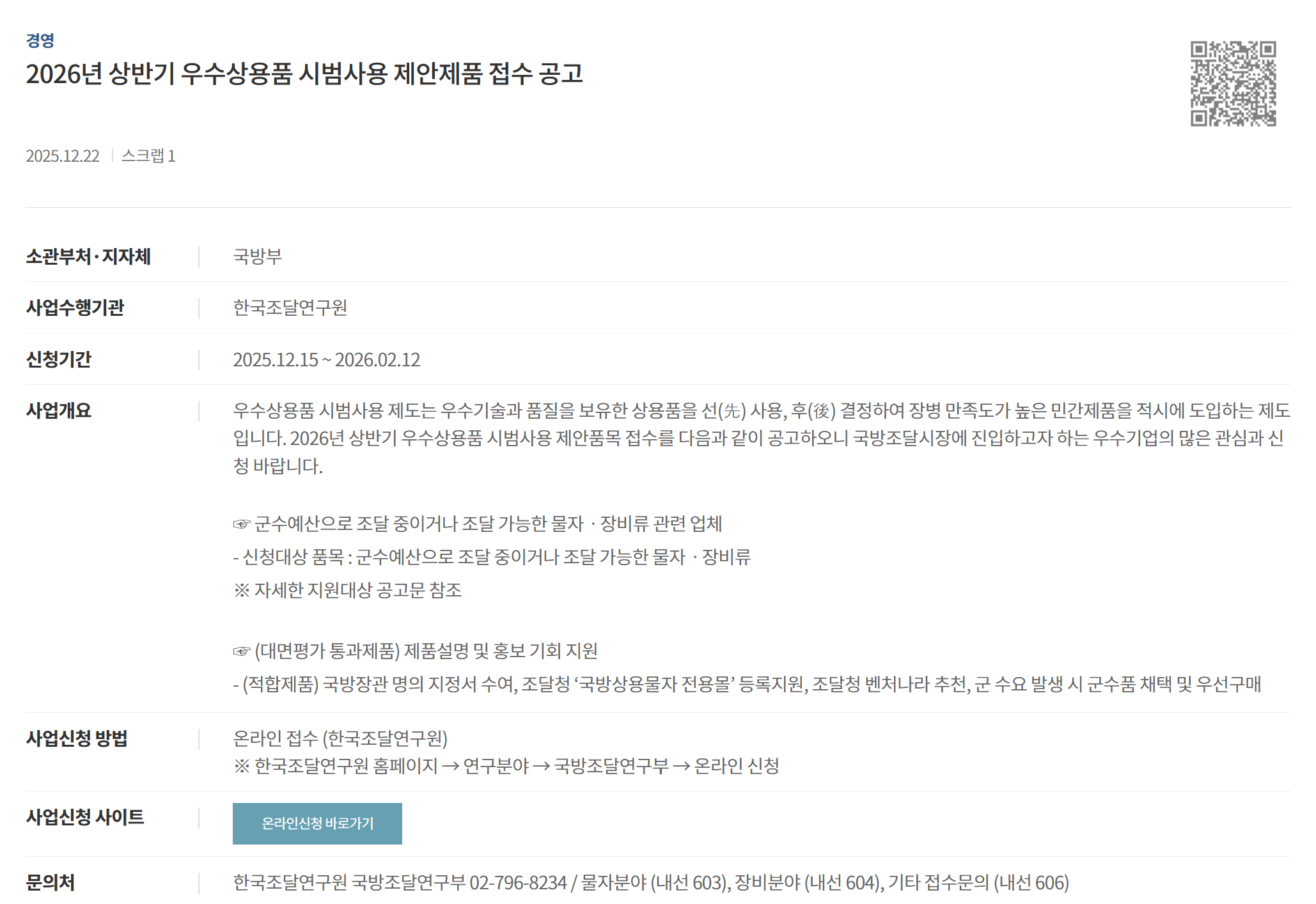 2026년 상반기 우수상용품 시범사용 제안제품 접수 공…
