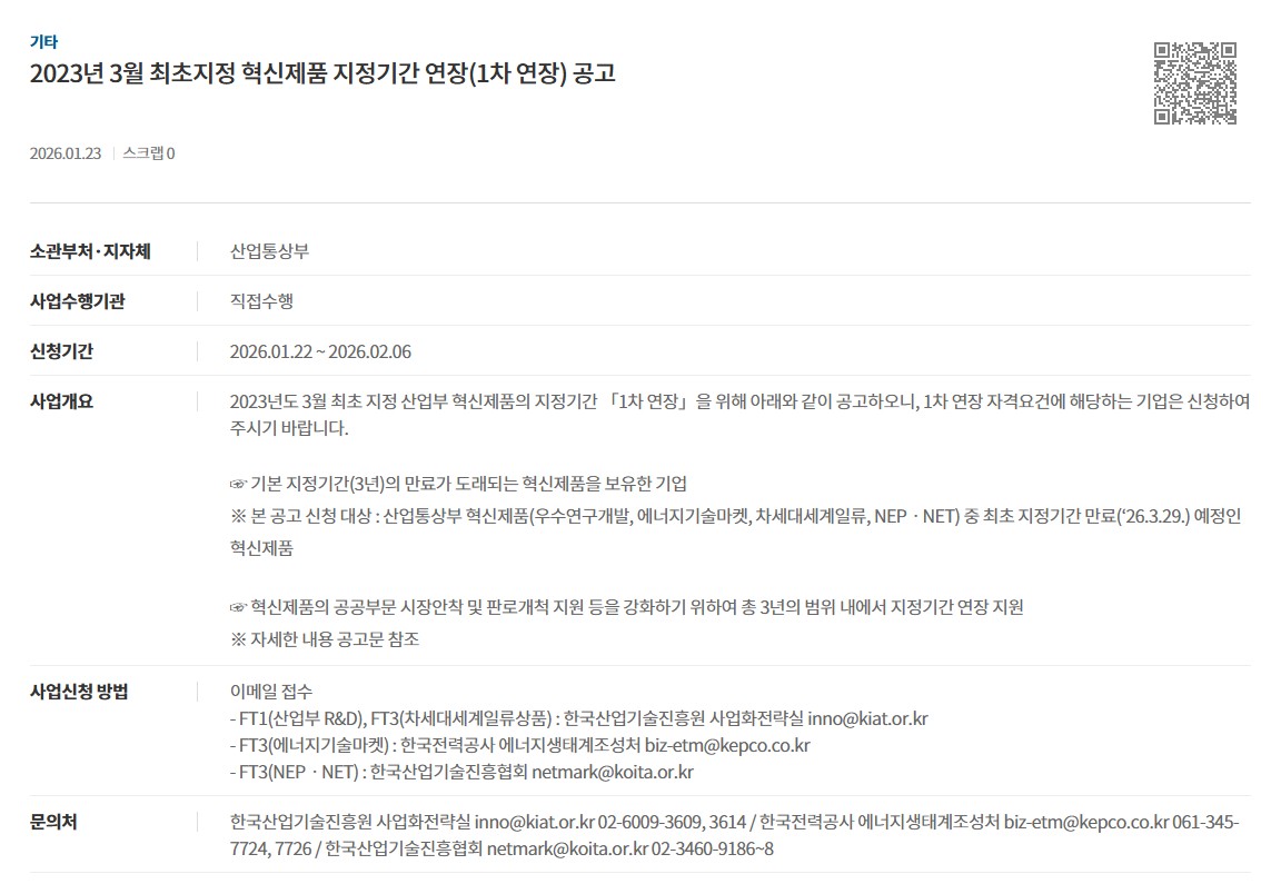 2026년 혁신제품 지정기간 연장(2차 연장) 공고