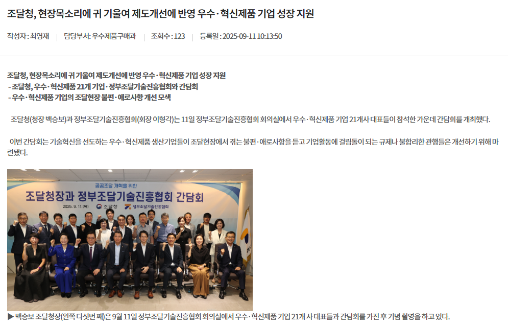조달청, 현장목소리에 귀 기울여 제도개선에 반영 우수·…