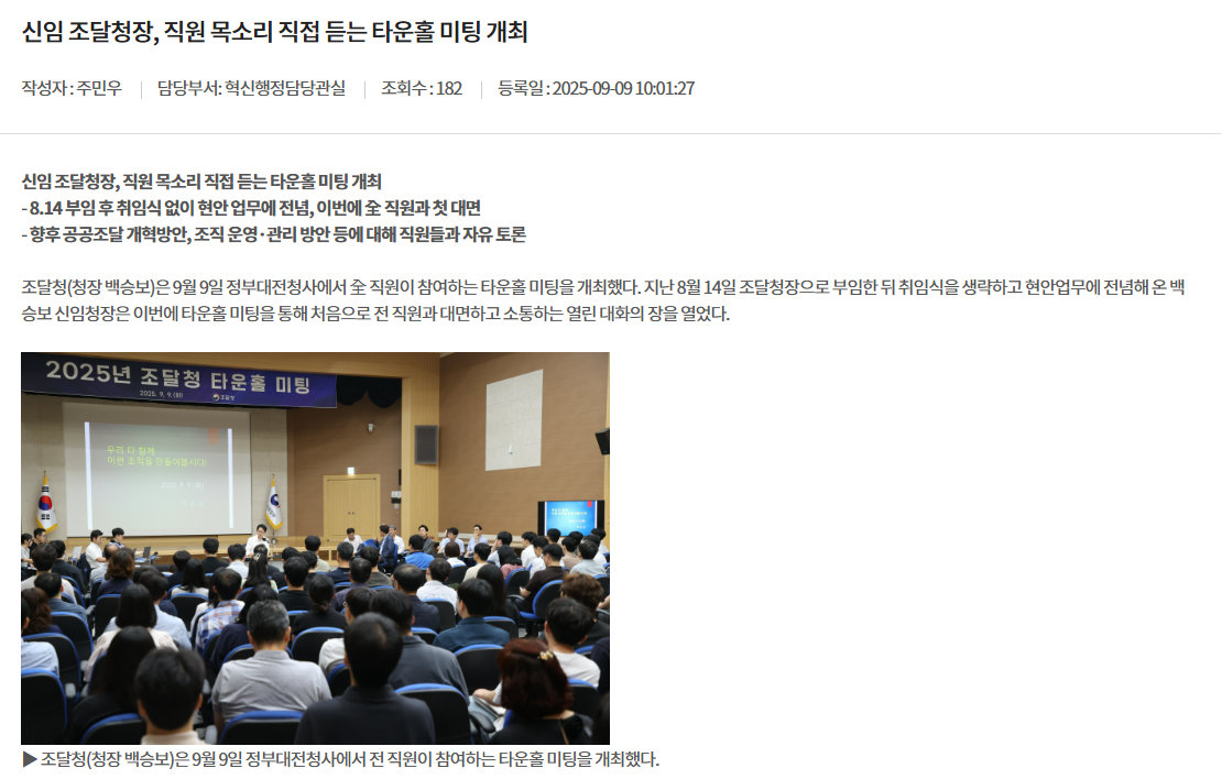 신임 조달청장, 직원 목소리 직접 듣는 타운홀 미팅 개…