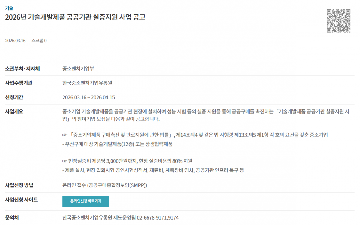 2026년 기술개발제품 공공기관 실증지원 사업 공고