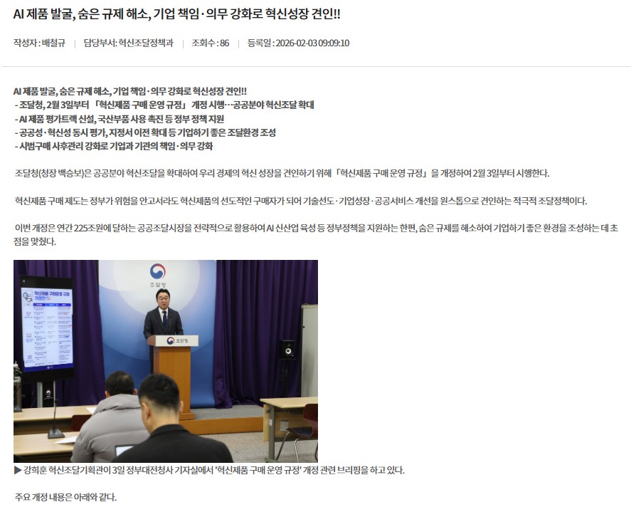 • 조달청 “’26년 혁신제품 시범구매 기본계획” 발표, …