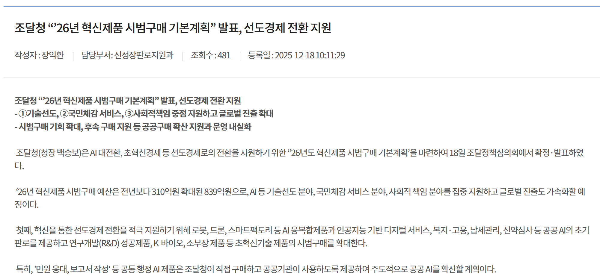 조달청 “’26년 혁신제품 시범구매 기본계획” 발표, …