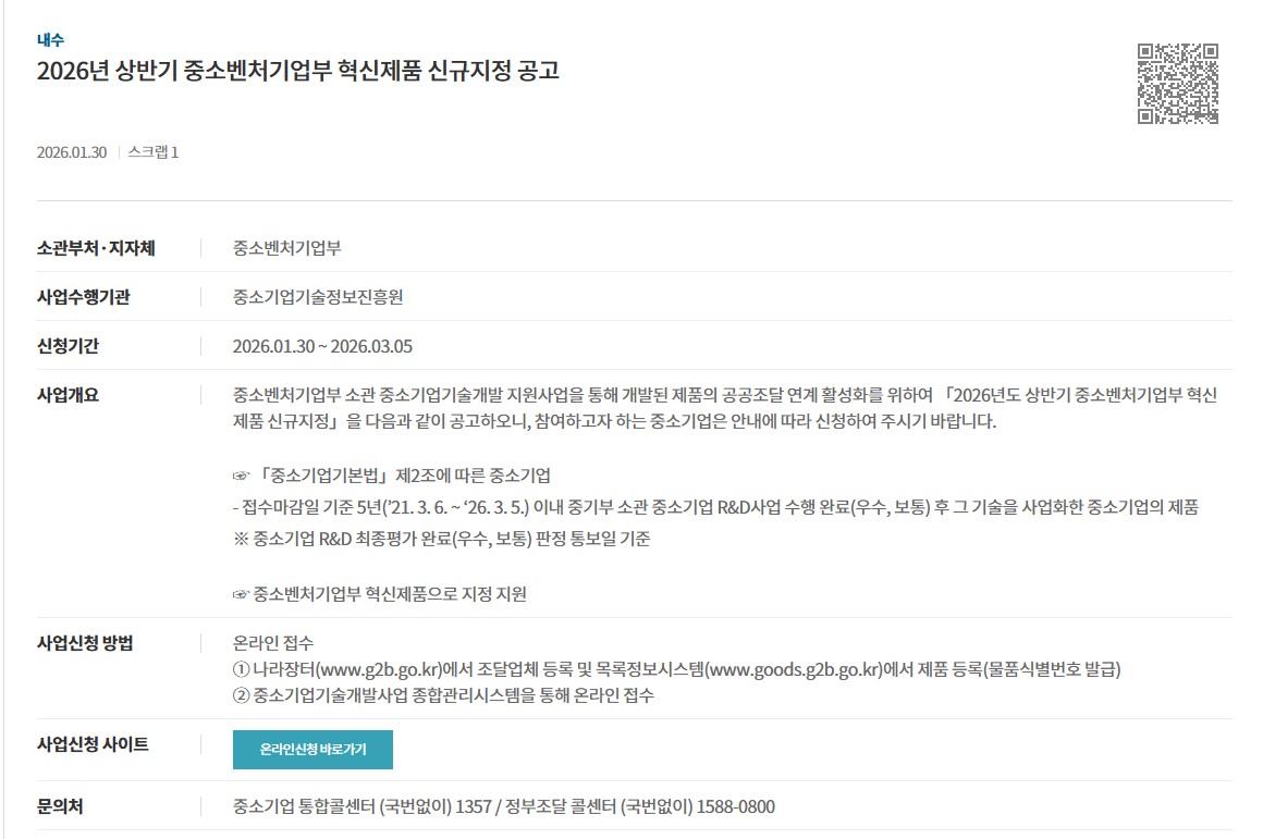 2026년 상반기 중소벤처기업부 혁신제품 신규지정 공고