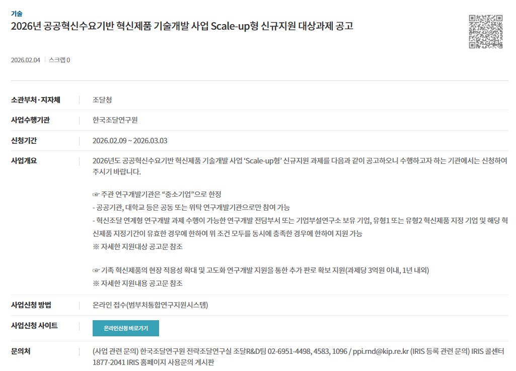 2026년 공공혁신수요기반 혁신제품 기술개발 사업 Sc…