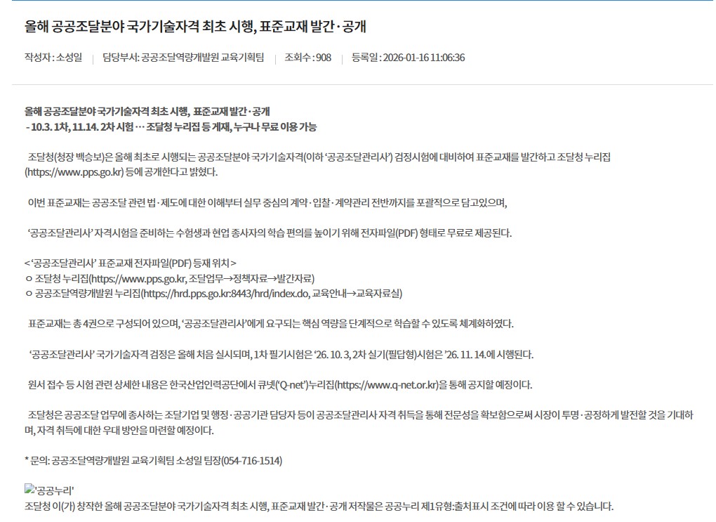 올해 공공조달분야 국가기술자격 최초 시행, 표준교재 발…