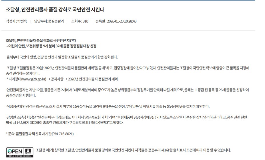 조달청, 안전관리물자 품질 강화로 국민안전 지킨다